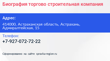 Биография, торгово-строительная компания по адресу 414000, Астраханская область, Астрахань, Адмиралтейская, 15 в дальнейшем Организация, размещена в следующих категориях: