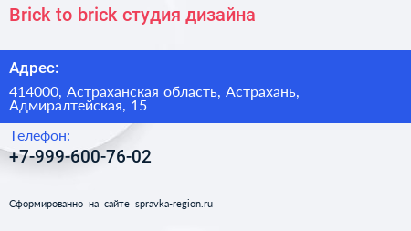 Brick to brick, студия дизайна по адресу 414000, Астраханская область, Астрахань, Адмиралтейская, 15 в дальнейшем Организация, размещена в следующих категориях: