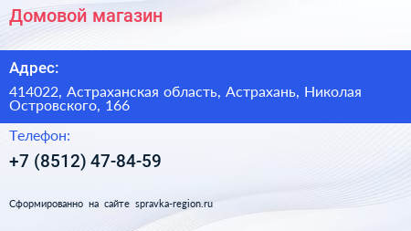 Домовой, магазин по адресу 414022, Астраханская область, Астрахань, Николая Островского, 166 в дальнейшем Организация, размещена в следующих категориях: