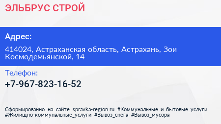 ЭЛЬБРУС-СТРОЙ по адресу 414024, Астраханская область, Астрахань, Зои Космодемьянской, 14 в дальнейшем Организация, размещена в следующих категориях: