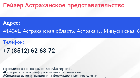 Гейзер, Астраханское представительство по адресу 414041, Астраханская область, Астрахань, Минусинская, 8 в дальнейшем Организация, размещена в следующих категориях:
