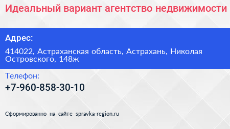 Идеальный вариант, агентство недвижимости по адресу 414022, Астраханская область, Астрахань, Николая Островского, 148ж в дальнейшем Организация, размещена в следующих категориях: