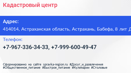 Кадастровый центр по адресу 414014, Астраханская область, Астрахань, Бабефа, 8 лит Д в дальнейшем Организация, размещена в следующих категориях: