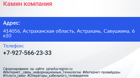 Камин, компания по адресу 414056, Астраханская область, Астрахань, Савушкина, 6 к10 в дальнейшем Организация, размещена в следующих категориях: