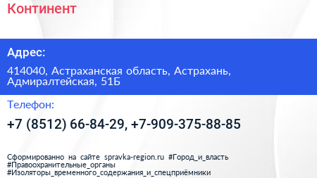 Континент по адресу 414040, Астраханская область, Астрахань, Адмиралтейская, 51Б в дальнейшем Организация, размещена в следующих категориях: