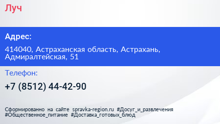 Луч по адресу 414040, Астраханская область, Астрахань, Адмиралтейская, 51 в дальнейшем Организация, размещена в следующих категориях: