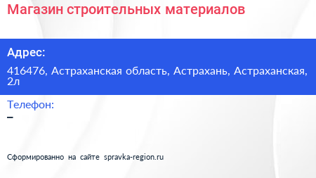Магазин строительных материалов по адресу 416476, Астраханская область, Астрахань, Астраханская, 2л в дальнейшем Организация, размещена в следующих категориях:
