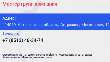 Мастер групп, компания по адресу 414040, Астраханская область, Астрахань, Московская, 12 в дальнейшем Организация, размещена в следующих категориях: