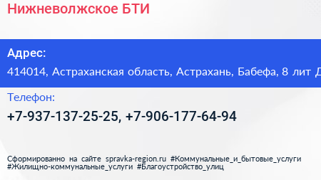 Нижневолжское БТИ по адресу 414014, Астраханская область, Астрахань, Бабефа, 8 лит Д в дальнейшем Организация, размещена в следующих категориях: