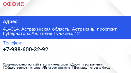 ОФФИС по адресу 414014, Астраханская область, Астрахань, проспект Губернатора Анатолия Гужвина, 12 в дальнейшем Организация, размещена в следующих категориях: