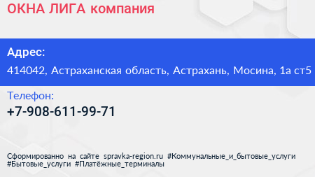 ОКНА-ЛИГА, компания по адресу 414042, Астраханская область, Астрахань, Мосина, 1а ст5 в дальнейшем Организация, размещена в следующих категориях: