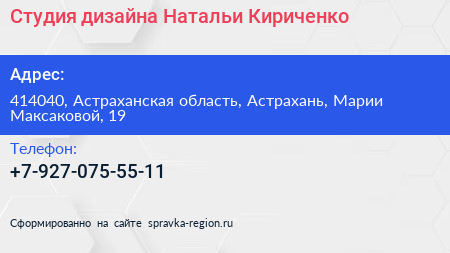 Студия дизайна Натальи Кириченко по адресу 414040, Астраханская область, Астрахань, Марии Максаковой, 19 в дальнейшем Организация, размещена в следующих категориях: