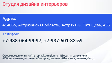 Студия дизайна интерьеров по адресу 414056, Астраханская область, Астрахань, Татищева, 43Б в дальнейшем Организация, размещена в следующих категориях:
