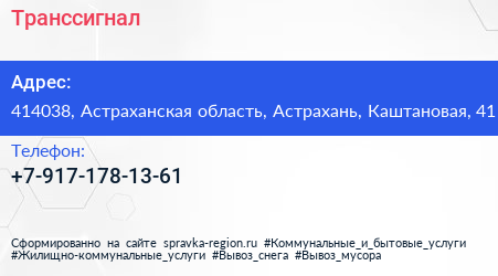 Транссигнал по адресу 414038, Астраханская область, Астрахань, Каштановая, 41 в дальнейшем Организация, размещена в следующих категориях: