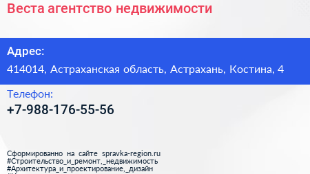 Веста, агентство недвижимости по адресу 414014, Астраханская область, Астрахань, Костина, 4 в дальнейшем Организация, размещена в следующих категориях: