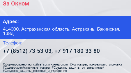 За Окном по адресу 414000, Астраханская область, Астрахань, Бакинская, 138д в дальнейшем Организация, размещена в следующих категориях: