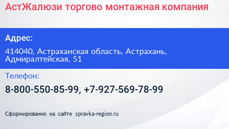 АстЖалюзи, торгово-монтажная компания по адресу 414040, Астраханская область, Астрахань, Адмиралтейская, 51 в дальнейшем Организация, размещена в следующих категориях: