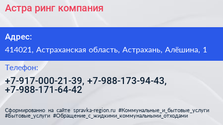 Астра-ринг, компания по адресу 414021, Астраханская область, Астрахань, Алёшина, 1 в дальнейшем Организация, размещена в следующих категориях: