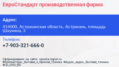 ЕвроСтандарт, производственная фирма по адресу 414000, Астраханская область, Астрахань, площадь Шаумяна, 3 в дальнейшем Организация, размещена в следующих категориях: