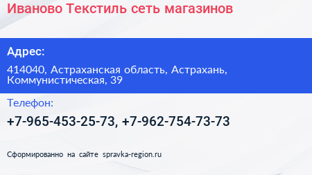 Иваново-Текстиль, сеть магазинов по адресу 414040, Астраханская область, Астрахань, Коммунистическая, 39 в дальнейшем Организация, размещена в следующих категориях: