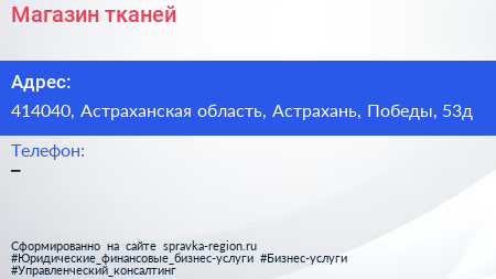 Магазин тканей по адресу 414040, Астраханская область, Астрахань, Победы, 53д в дальнейшем Организация, размещена в следующих категориях: