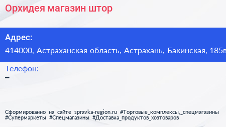 Орхидея, магазин штор по адресу 414000, Астраханская область, Астрахань, Бакинская, 185в в дальнейшем Организация, размещена в следующих категориях: