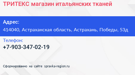ТРИТЕКС, магазин итальянских тканей по адресу 414040, Астраханская область, Астрахань, Победы, 53д в дальнейшем Организация, размещена в следующих категориях: