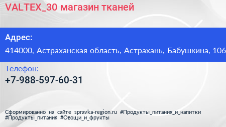 VALTEX_30, магазин тканей по адресу 414000, Астраханская область, Астрахань, Бабушкина, 106 в дальнейшем Организация, размещена в следующих категориях: