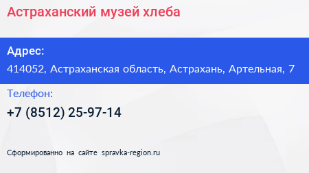 Астраханский музей хлеба по адресу 414052, Астраханская область, Астрахань, Артельная, 7 в дальнейшем Организация, размещена в следующих категориях: