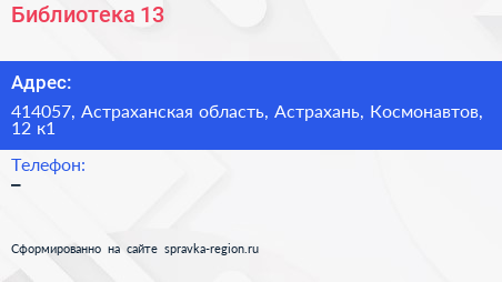 Библиотека №13 по адресу 414057, Астраханская область, Астрахань, Космонавтов, 12 к1 в дальнейшем Организация, размещена в следующих категориях: