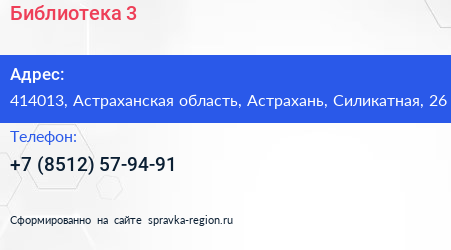 Библиотека №3 по адресу 414013, Астраханская область, Астрахань, Силикатная, 26 в дальнейшем Организация, размещена в следующих категориях: