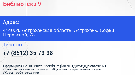 Библиотека №9 по адресу 414004, Астраханская область, Астрахань, Софьи Перовской, 73 в дальнейшем Организация, размещена в следующих категориях: