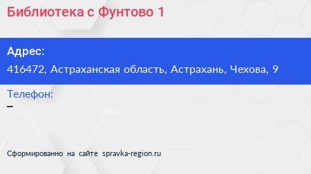 Библиотека, с. Фунтово-1 по адресу 416472, Астраханская область, Астрахань, Чехова, 9 в дальнейшем Организация, размещена в следующих категориях: