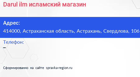 Darul`ilm, исламский магазин по адресу 414000, Астраханская область, Астрахань, Свердлова, 106 в дальнейшем Организация, размещена в следующих категориях: