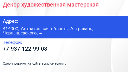 Декор, художественная мастерская по адресу 414000, Астраханская область, Астрахань, Чернышевского, 4 в дальнейшем Организация, размещена в следующих категориях: