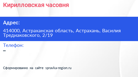 Кирилловская часовня по адресу 414000, Астраханская область, Астрахань, Василия Тредиаковского, 2/19 в дальнейшем Организация, размещена в следующих категориях: