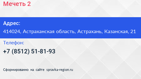 Мечеть №2 по адресу 414024, Астраханская область, Астрахань, Казанская, 21 в дальнейшем Организация, размещена в следующих категориях: