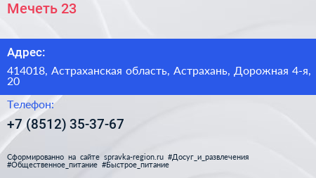Мечеть №23 по адресу 414018, Астраханская область, Астрахань, Дорожная 4-я, 20 в дальнейшем Организация, размещена в следующих категориях: