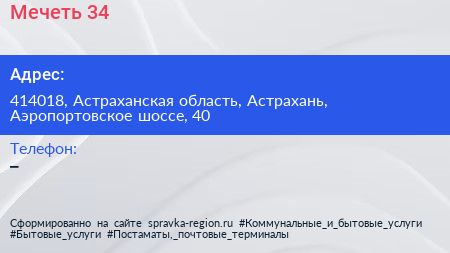 Мечеть №34 по адресу 414018, Астраханская область, Астрахань, Аэропортовское шоссе, 40 в дальнейшем Организация, размещена в следующих категориях: