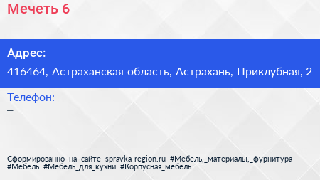 Мечеть №6 по адресу 416464, Астраханская область, Астрахань, Приклубная, 2 в дальнейшем Организация, размещена в следующих категориях: