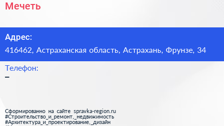 Мечеть по адресу 416462, Астраханская область, Астрахань, Фрунзе, 34 в дальнейшем Организация, размещена в следующих категориях:
