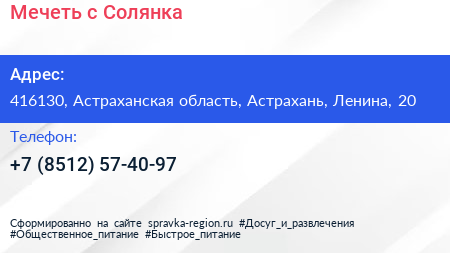 Мечеть, с. Солянка по адресу 416130, Астраханская область, Астрахань, Ленина, 20 в дальнейшем Организация, размещена в следующих категориях: