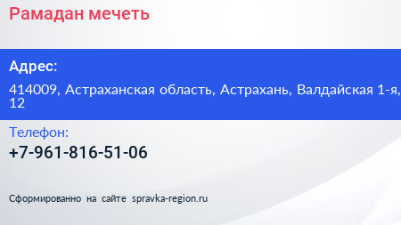 Рамадан, мечеть по адресу 414009, Астраханская область, Астрахань, Валдайская 1-я, 12 в дальнейшем Организация, размещена в следующих категориях: