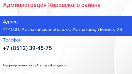 Администрация Кировского района по адресу 414000, Астраханская область, Астрахань, Ленина, 28 в дальнейшем Организация, размещена в следующих категориях: