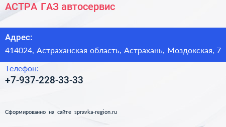 АСТРА-ГАЗ, автосервис по адресу 414024, Астраханская область, Астрахань, Моздокская, 7 в дальнейшем Организация, размещена в следующих категориях:
