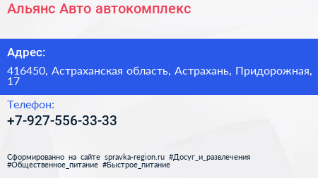 Альянс Авто, автокомплекс по адресу 416450, Астраханская область, Астрахань, Придорожная, 17 в дальнейшем Организация, размещена в следующих категориях: