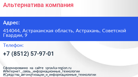 Альтернатива, компания по адресу 414044, Астраханская область, Астрахань, Советской Гвардии, 9 в дальнейшем Организация, размещена в следующих категориях: