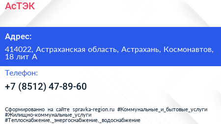 АсТЭК по адресу 414022, Астраханская область, Астрахань, Космонавтов, 18 лит А в дальнейшем Организация, размещена в следующих категориях: