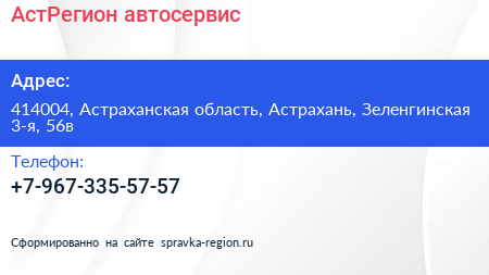 АстРегион, автосервис по адресу 414004, Астраханская область, Астрахань, Зеленгинская 3-я, 56в в дальнейшем Организация, размещена в следующих категориях: