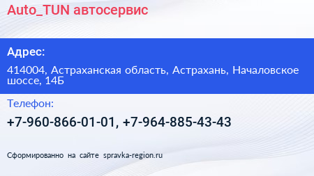 Auto_TUN, автосервис по адресу 414004, Астраханская область, Астрахань, Началовское шоссе, 14Б в дальнейшем Организация, размещена в следующих категориях: